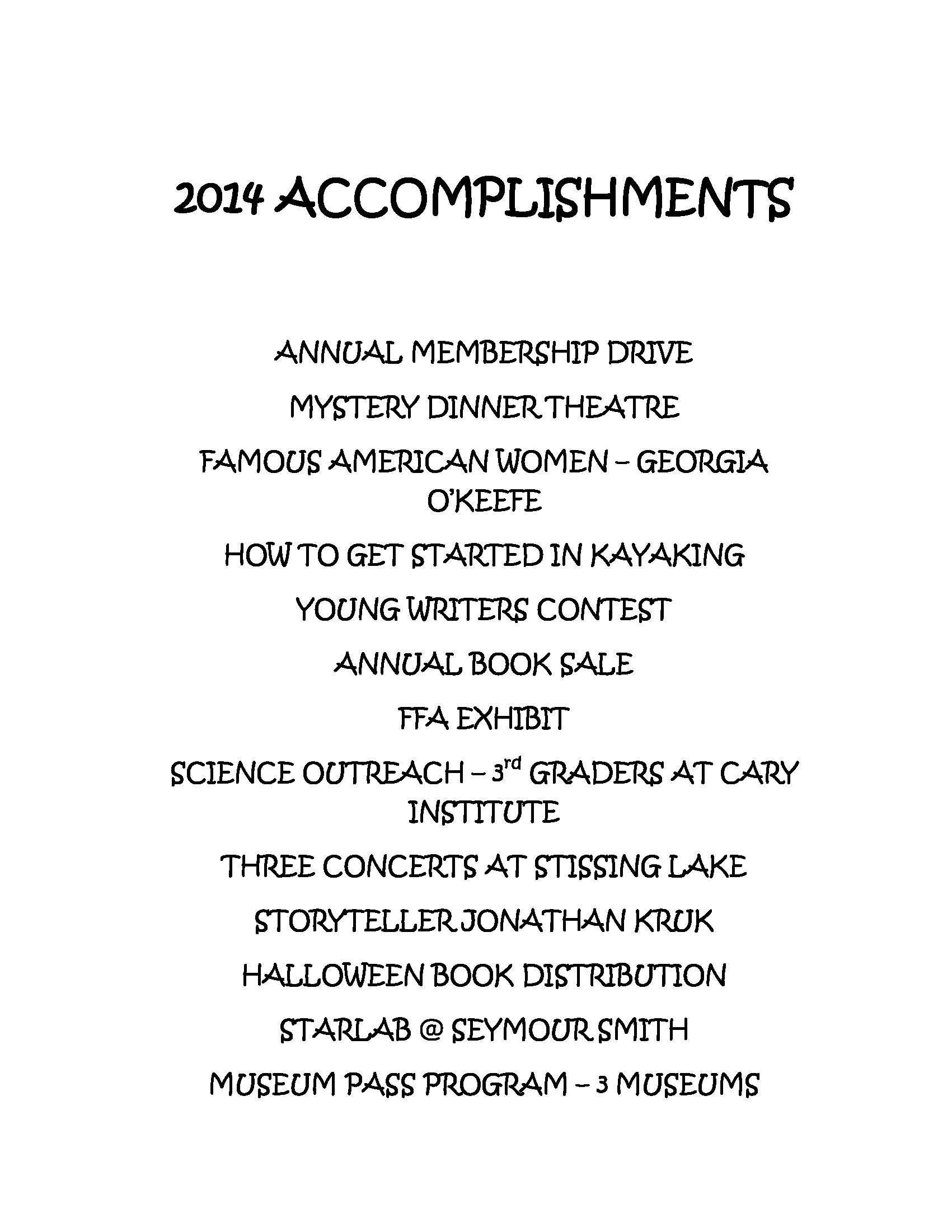 2014 ACCOMPLISHMENTS Mar27 Share this: Click to share on Facebook (Opens in new window) Facebook Click to email a link to a friend (Opens in new window) Email Click to print (Opens in new window) Print More Click to share on X (Opens in new window) X Like Loading... Related