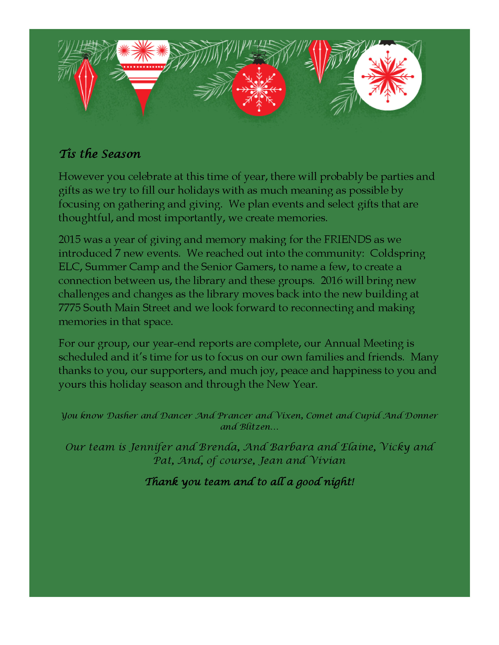 December 2015 Newsletter Dec20 Share this: Click to share on Facebook (Opens in new window) Facebook Click to email a link to a friend (Opens in new window) Email Click to print (Opens in new window) Print More Click to share on X (Opens in new window) X Like Loading... Related
