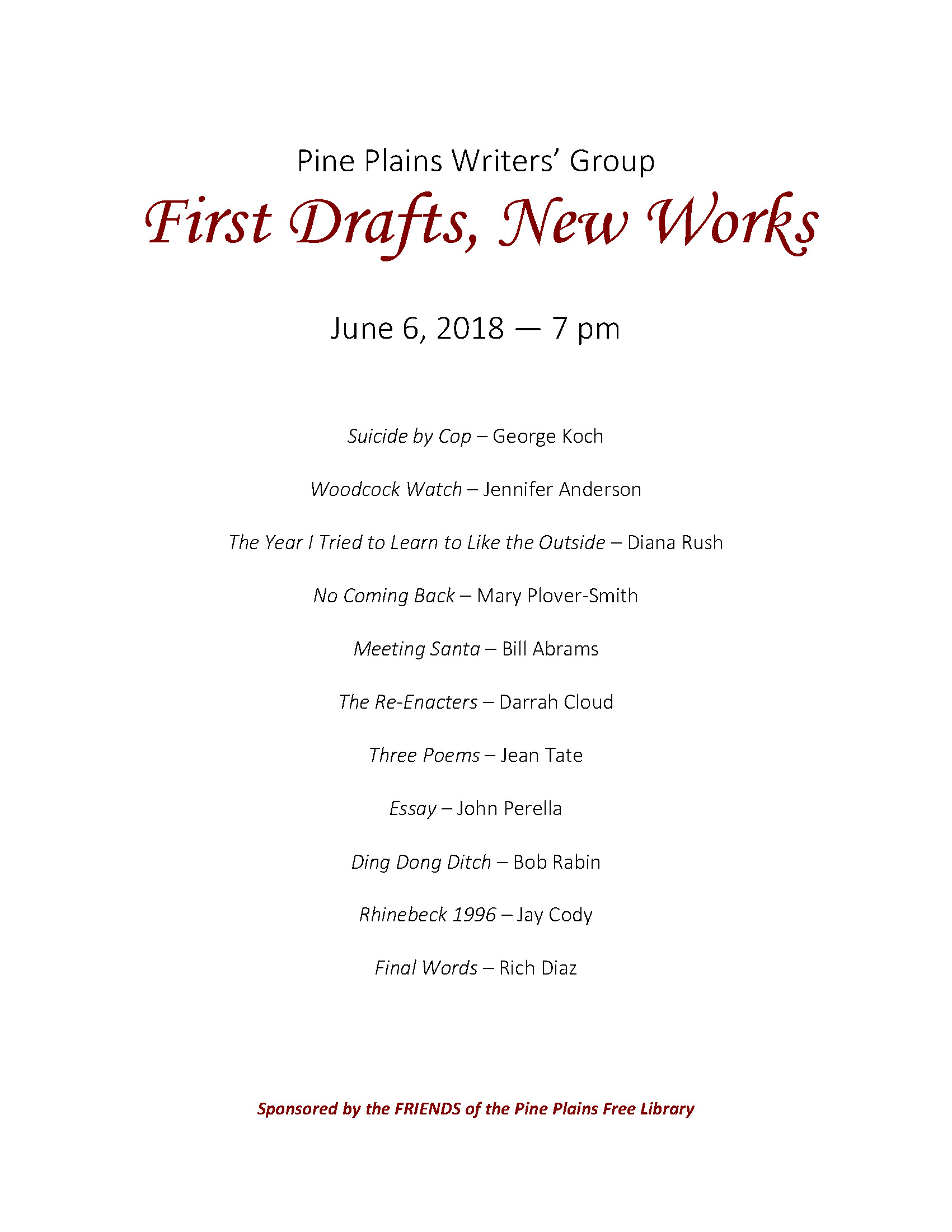 Pine Plains Writers Group “First Drafts, New Works” Jun7 Share this: Click to share on Facebook (Opens in new window) Facebook Click to email a link to a friend (Opens in new window) Email Click to print (Opens in new window) Print More Click to share on X (Opens in new window) X Like Loading... Related