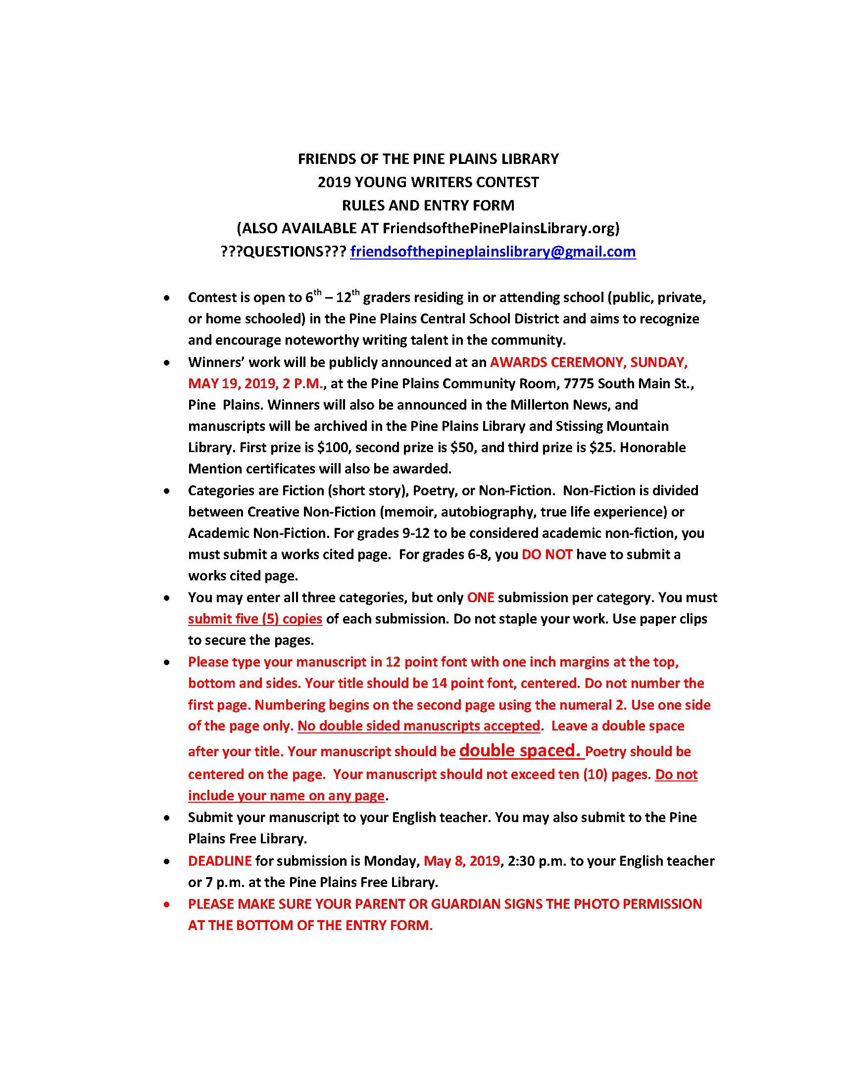 2019 Young Writers Contest Rules Mar7 Share this: Click to share on Facebook (Opens in new window) Facebook Click to email a link to a friend (Opens in new window) Email Click to print (Opens in new window) Print More Click to share on X (Opens in new window) X Like Loading... Related