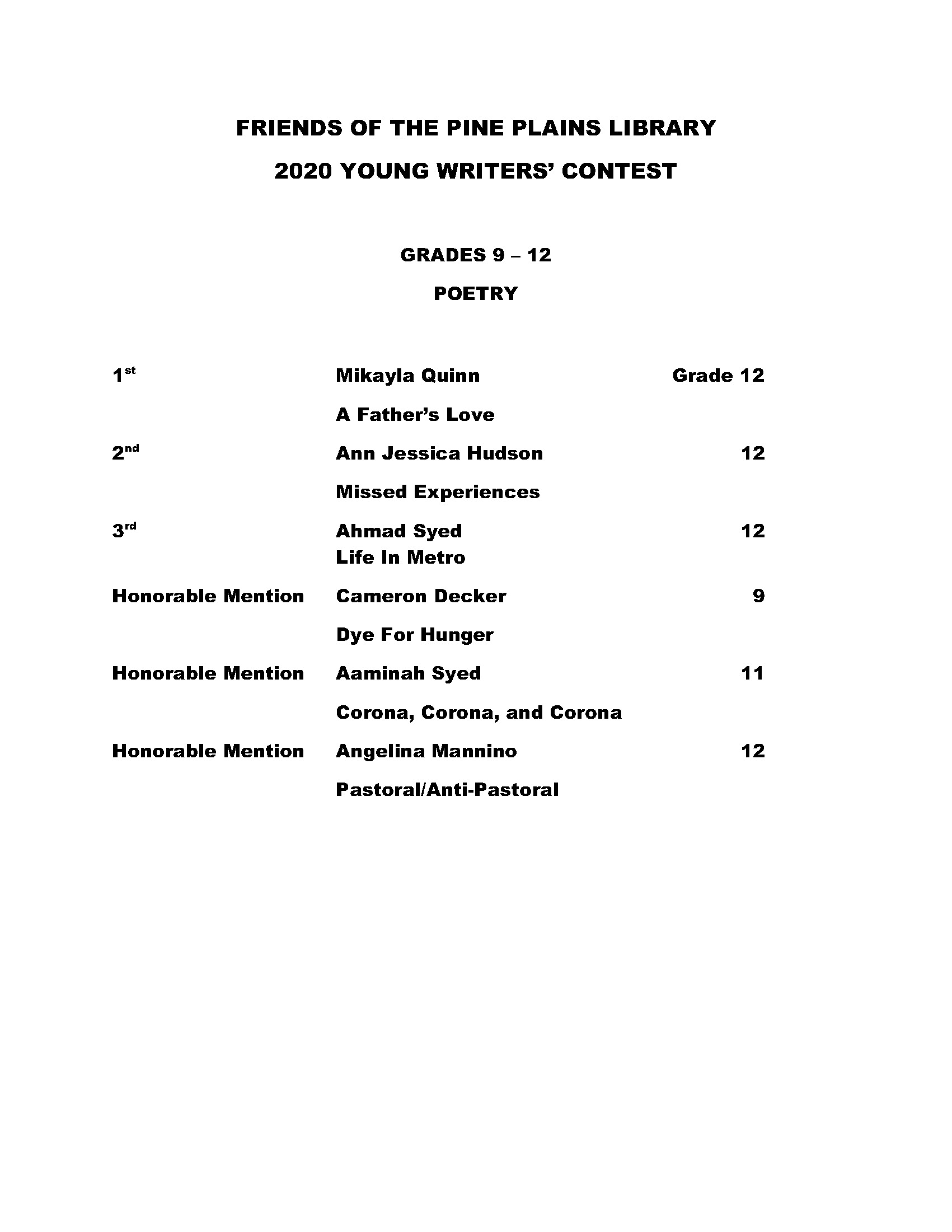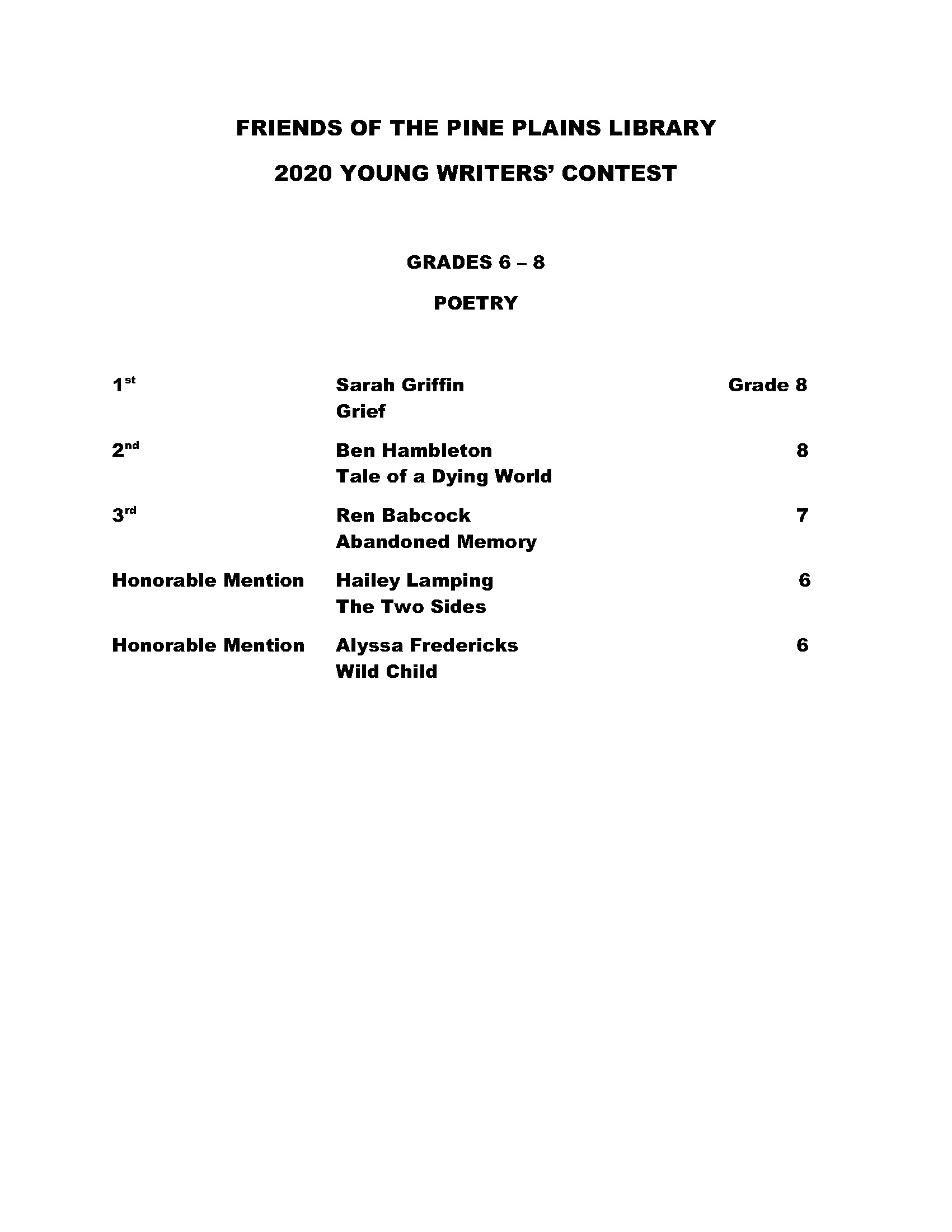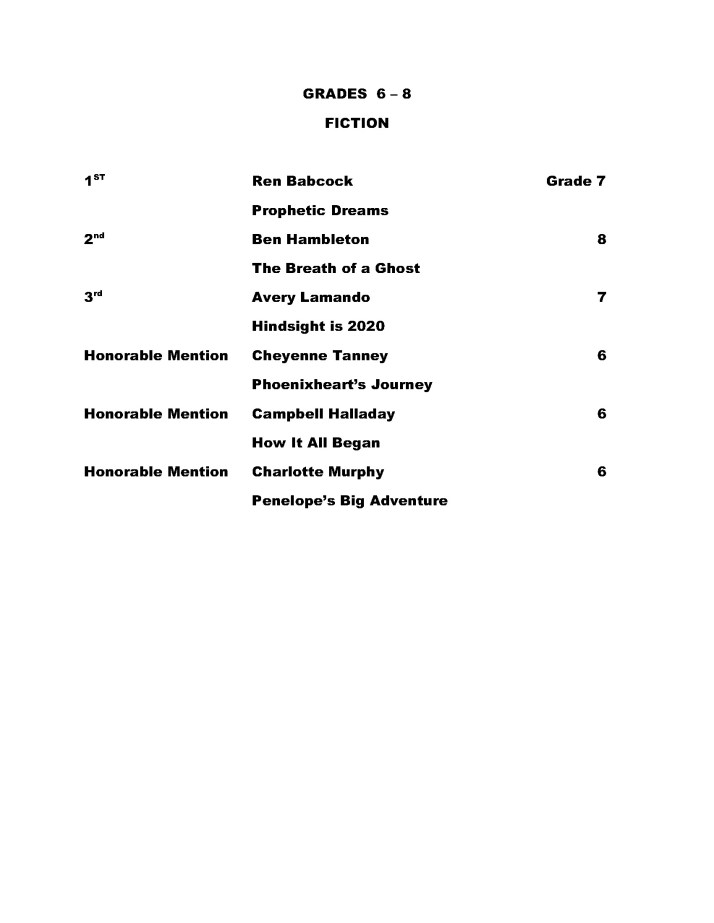 Young Writers Contest 2020 Winners Jun9 Share this: Click to share on Facebook (Opens in new window) Facebook Click to email a link to a friend (Opens in new window) Email Click to print (Opens in new window) Print More Click to share on X (Opens in new window) X Like Loading... Related