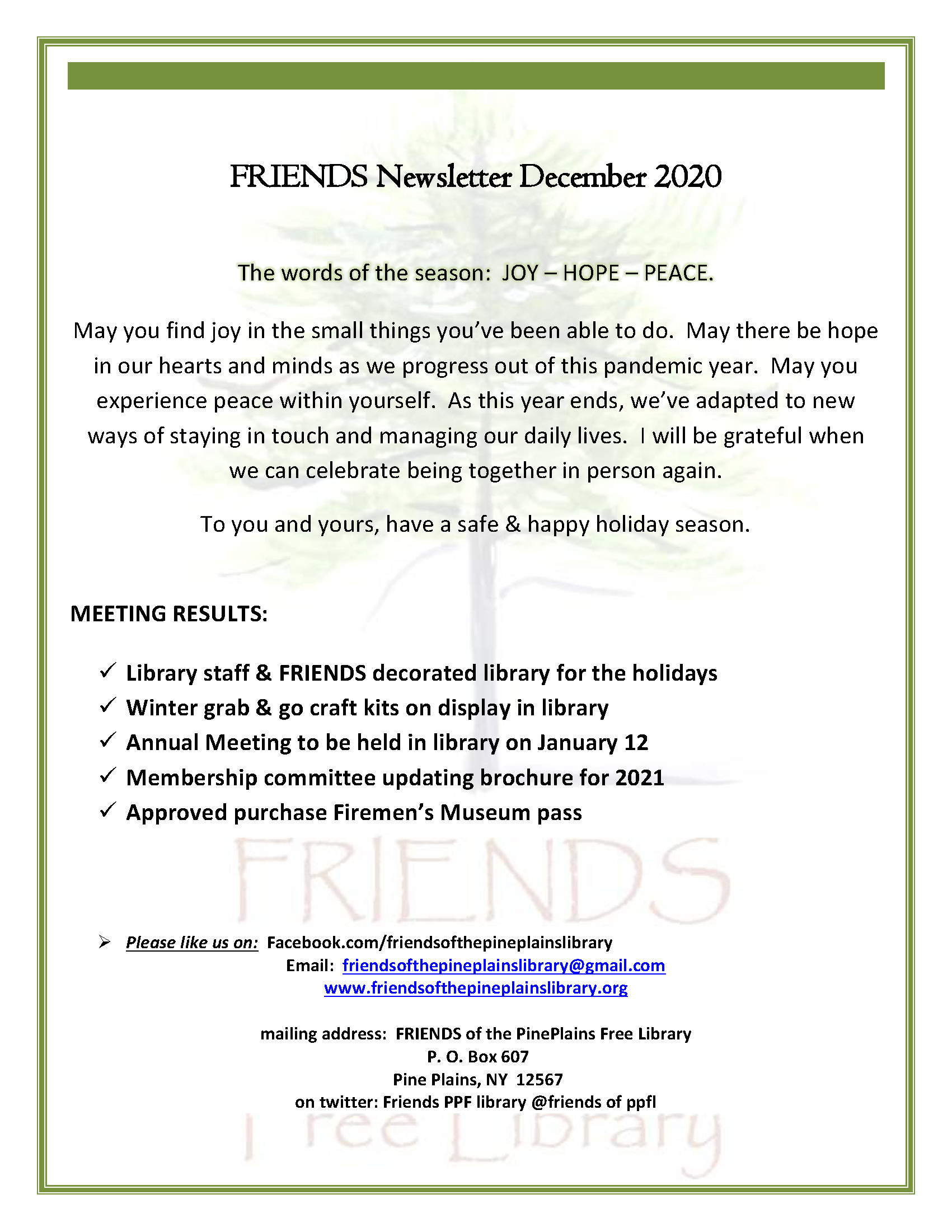 Newsletter Dec. 2020 Dec14 Share this: Click to share on Facebook (Opens in new window) Facebook Click to email a link to a friend (Opens in new window) Email Click to print (Opens in new window) Print More Click to share on X (Opens in new window) X Like Loading... Related