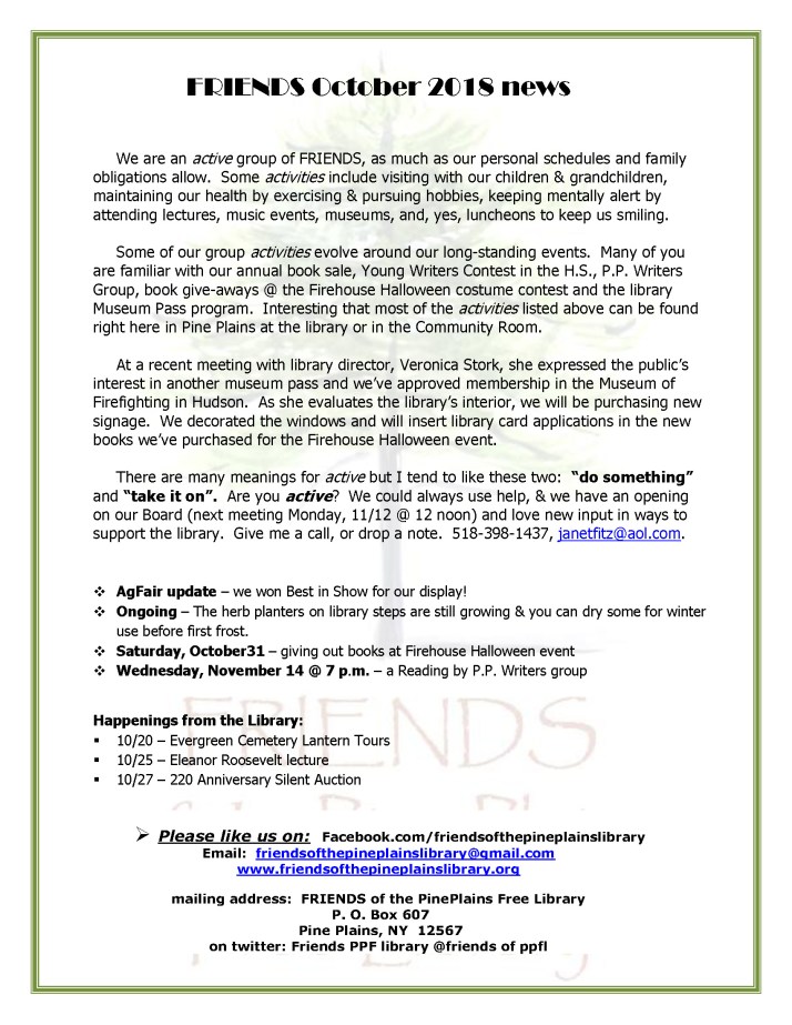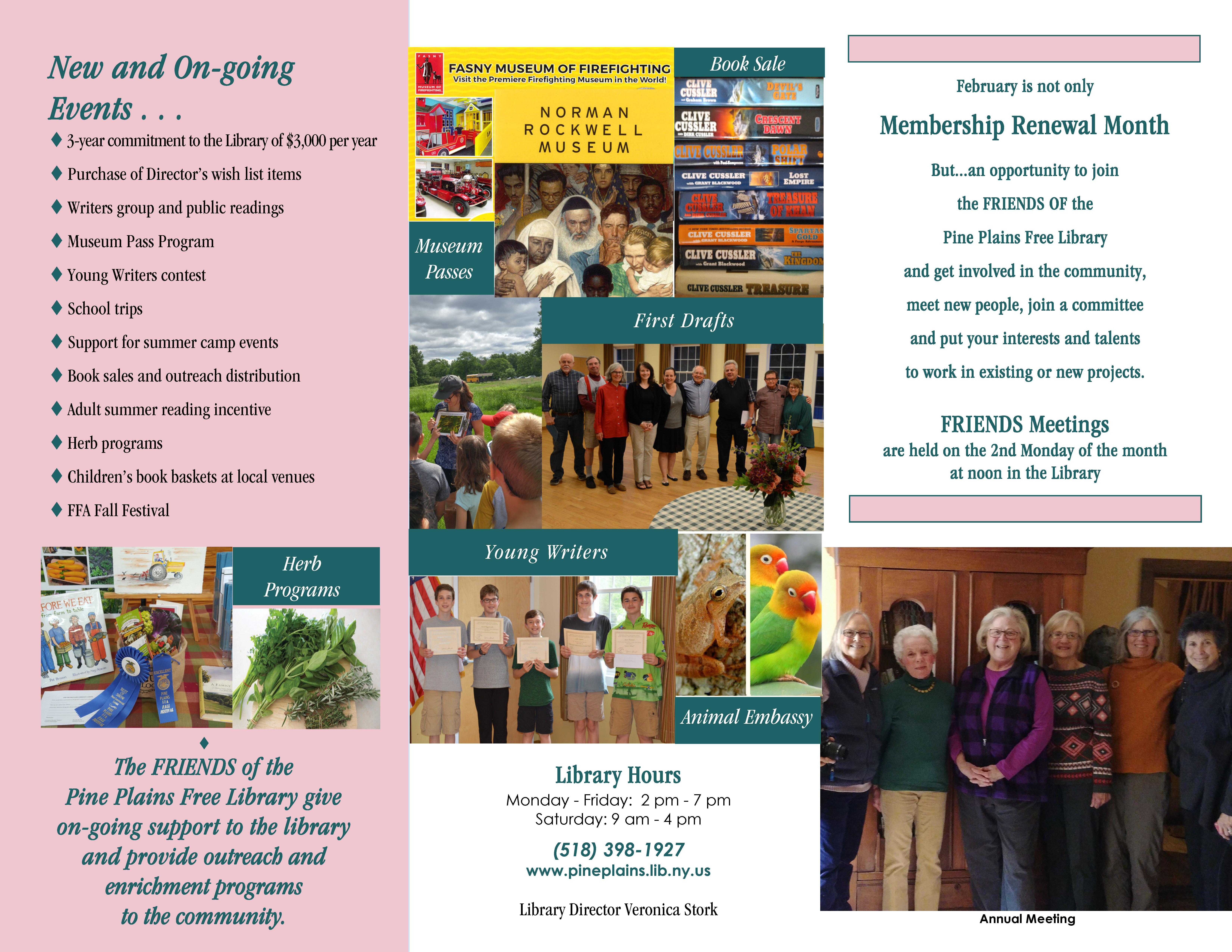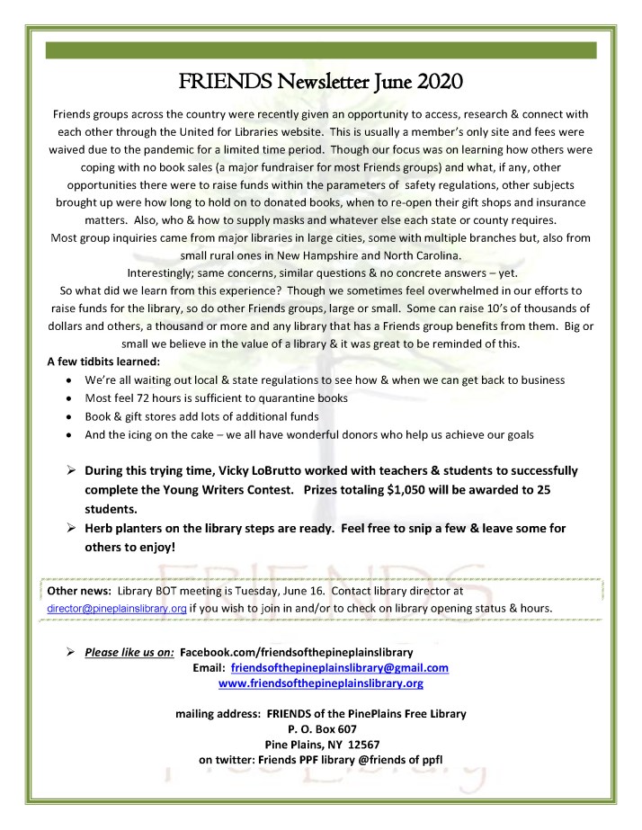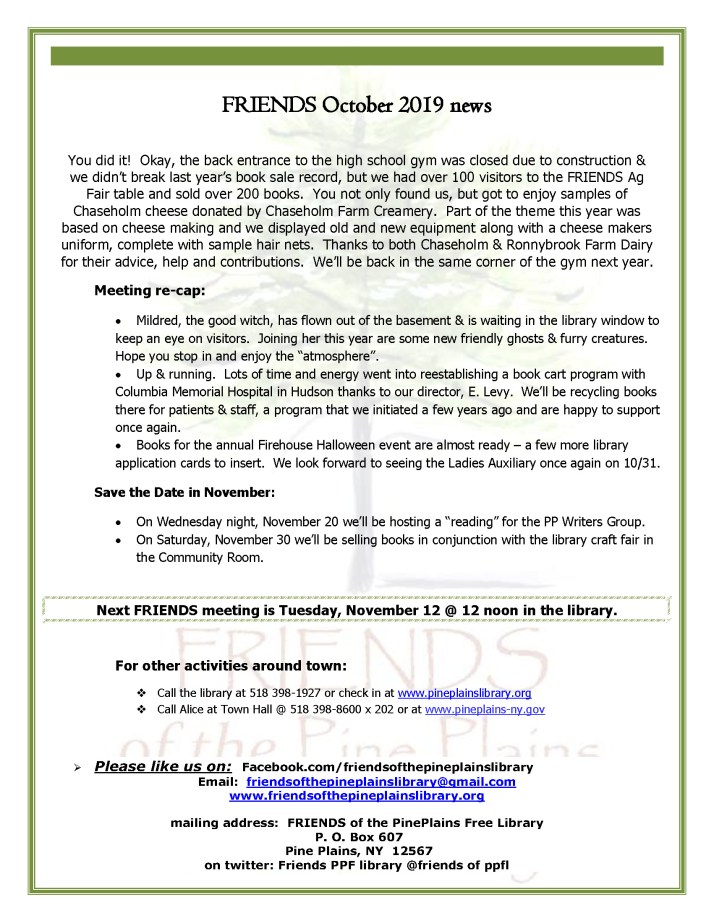The FRIENDS of the Pine Plains Library will now meet on the SECOND TUESDAY of each month, 12 noon in the Library.