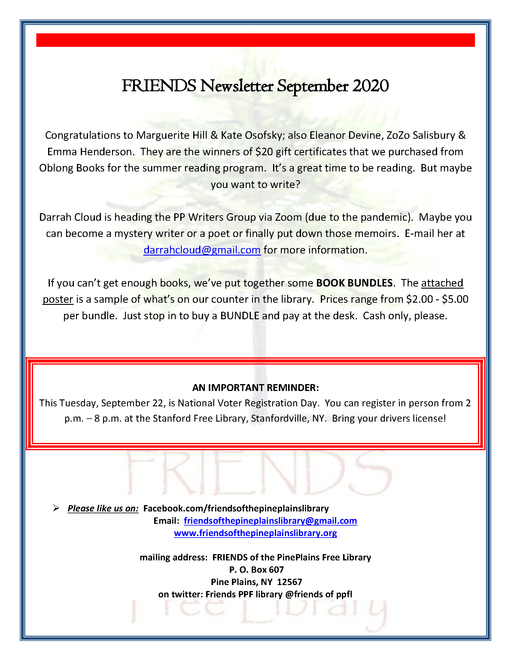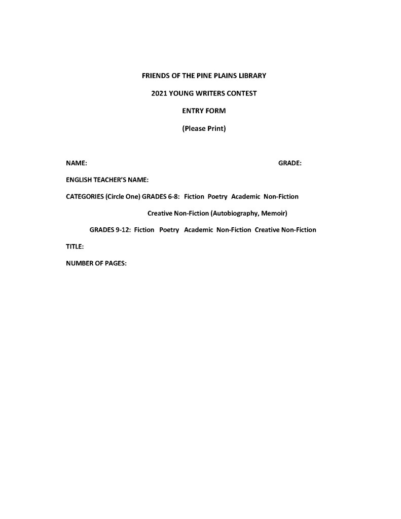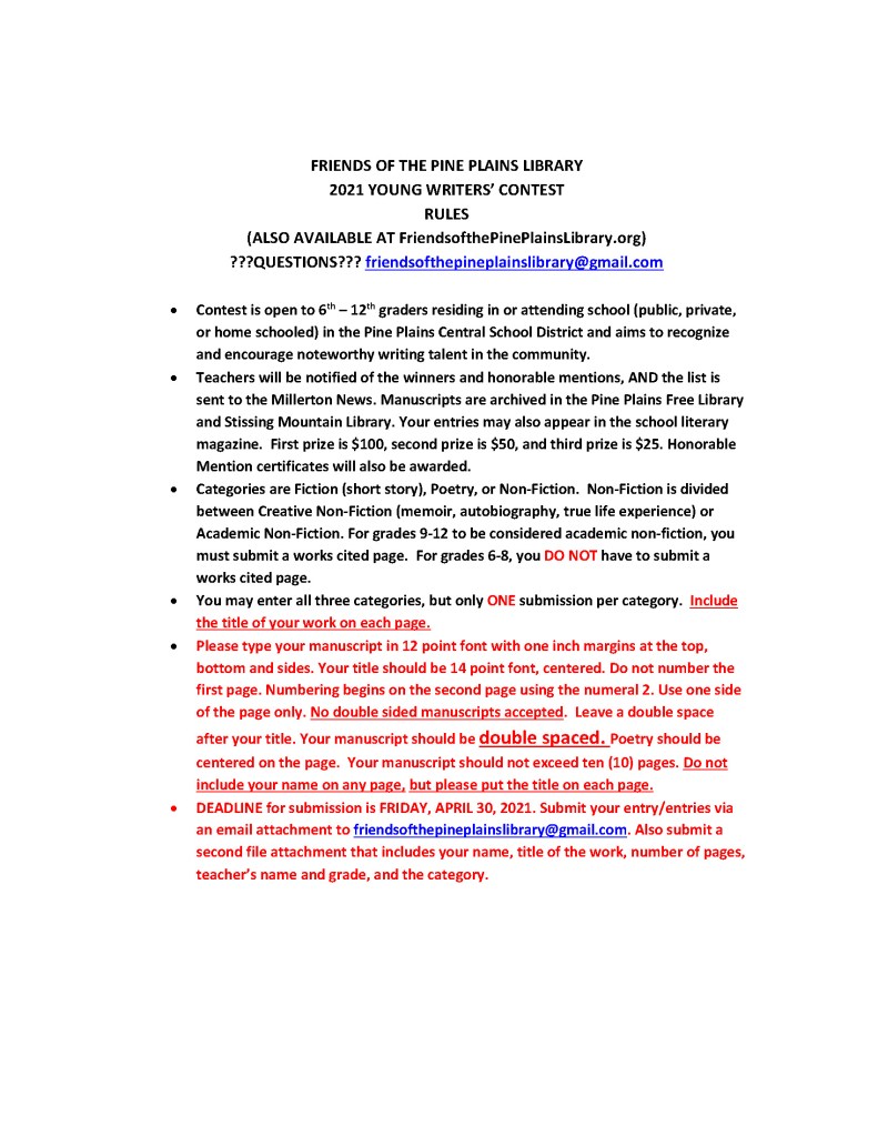 The new date is May 11, 2020. You may submit to friendsofthepineplainslibrary@gmail.com. Include your entry as an attachment and include a separate page with your name, title, teacher’s name, grade, category. Please follow all other rules listed on the rules page. If you do not have that at home, please check this web site.